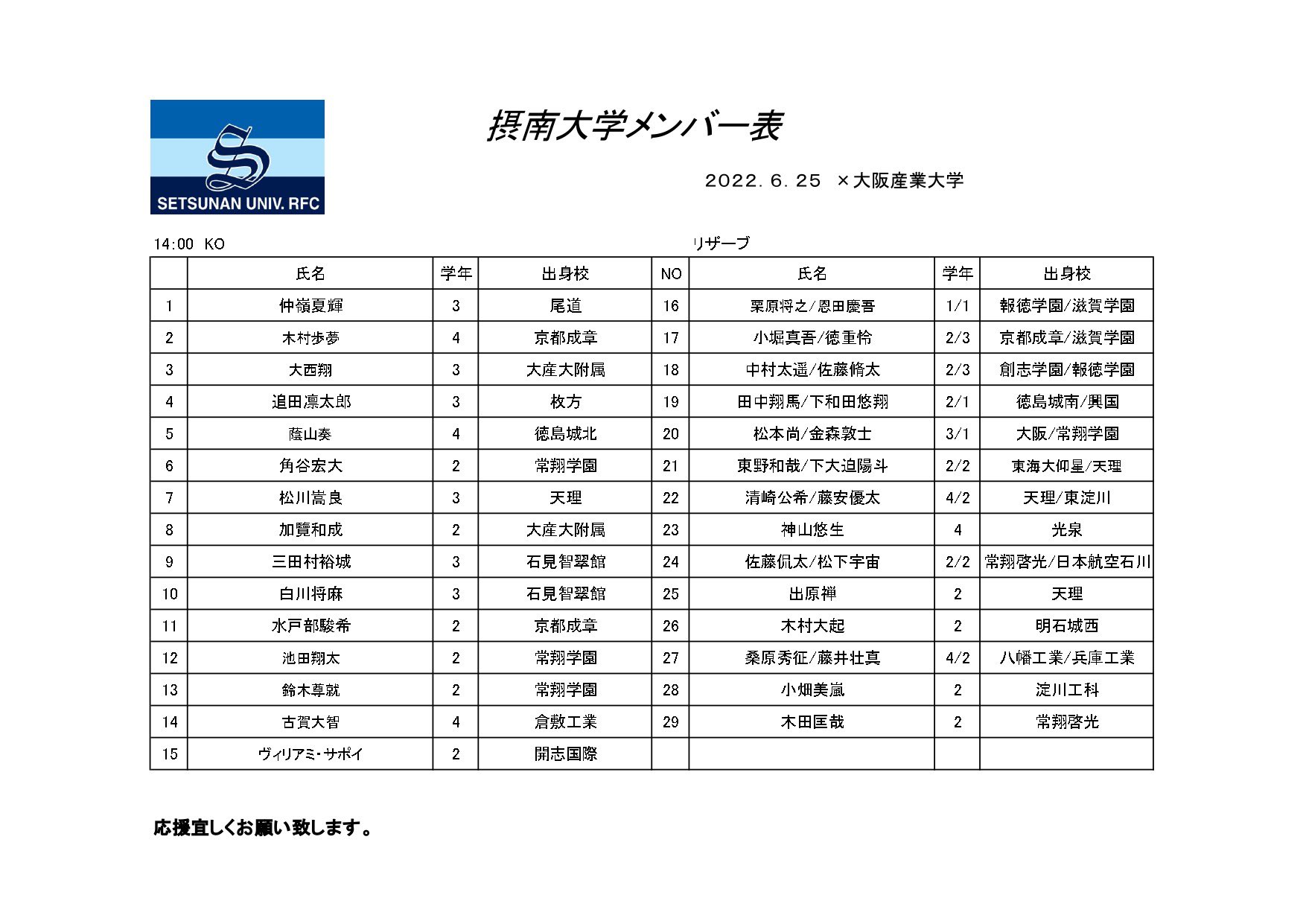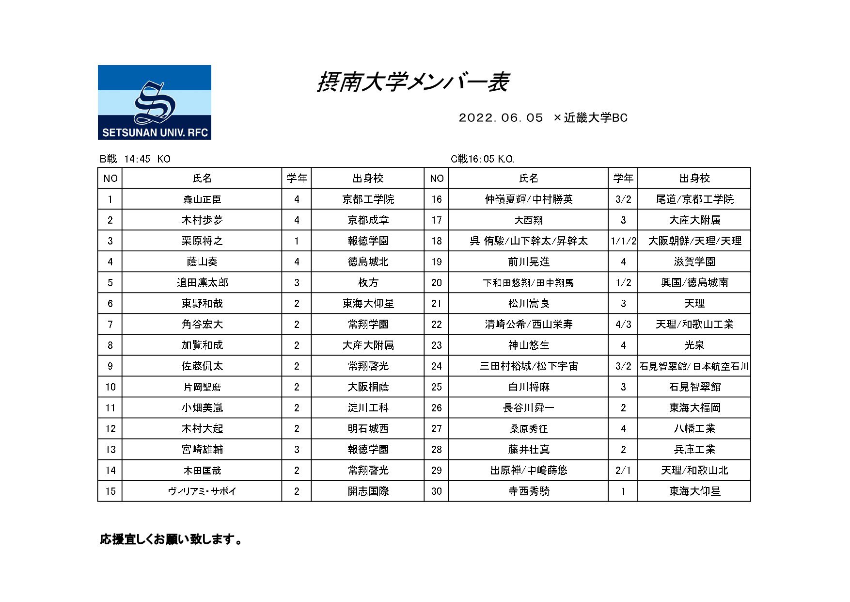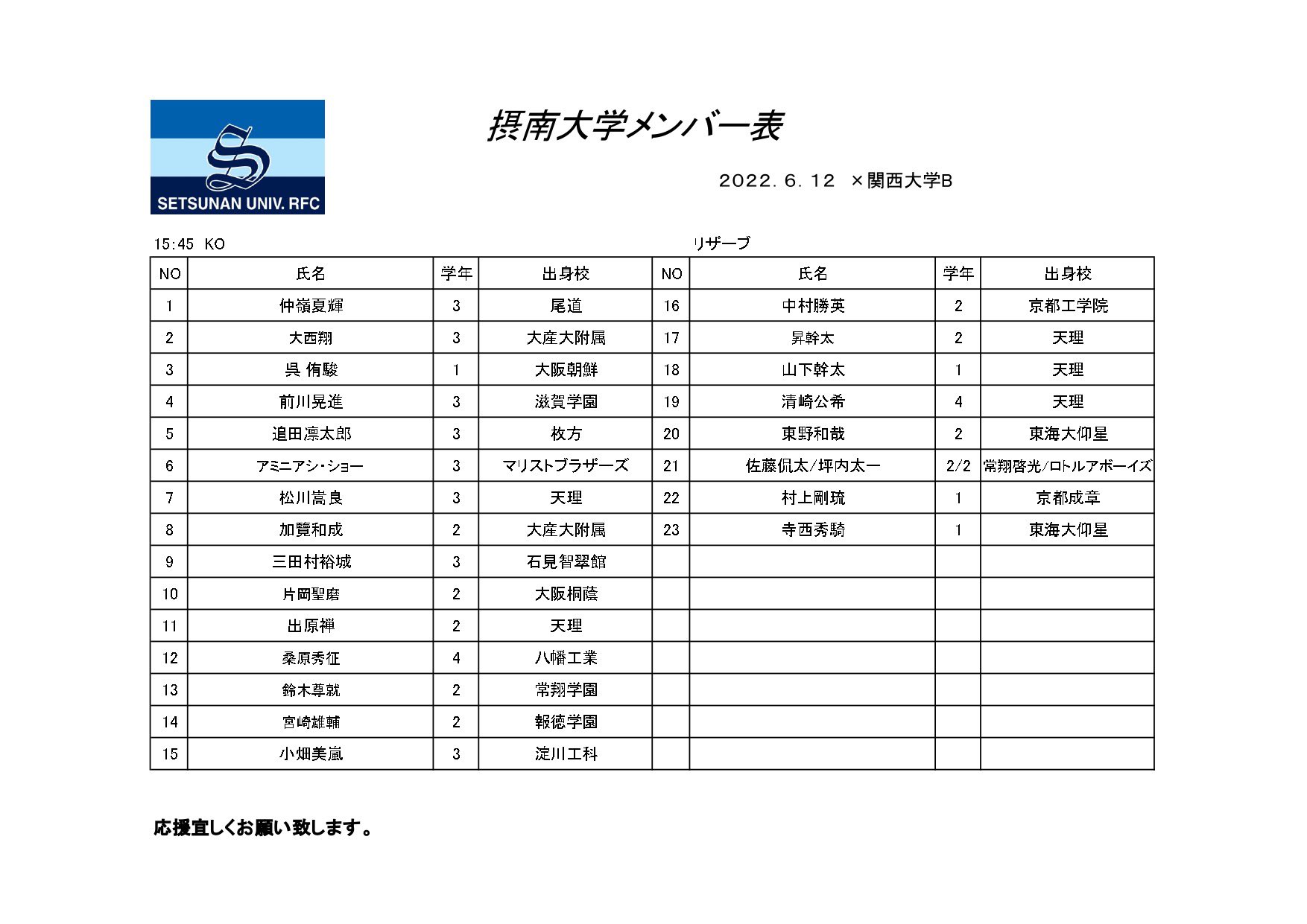 | 6月12日(日) KO15:45 | ![]() | 24 摂南大学B | 19前半24 5後半31 MEMBER | 55 関西大学B | ![]() | 摂南大学G |