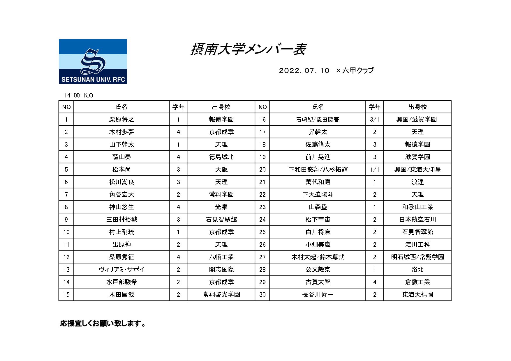 | 7月10日(日) KO14:00 | ![]() | 50 摂南大学 | 19前半21 31後半26 MEMBER | 47 六甲クラブ | ![]() | 摂南大学G |